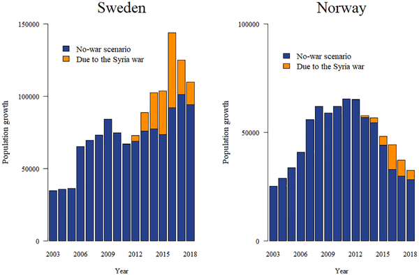 واعتبرت إليونورا موسينو، باحثة في الجامعة، أنّه "لولا الحرب في سوريا وتهجير كل هذا العدد من السوريين إلى أوروبا، لكانت الاتجاهات السكانية في بلدان مثل السويد والنرويج على مدى السنوات القليلة الماضية مختلفة تماماً".